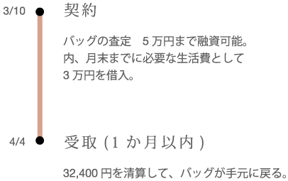OLのSさんは最近はまっているネットショッピングの支払いがかさんでしまい、月末の給料日までのやりくりが難しくなってしまいました。そこで、去年の誕生日に母親からプレゼントされたヴィトンのバッグをまるいさんに預けてお金を借りることにしました。