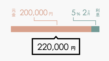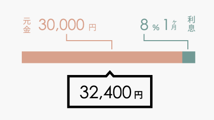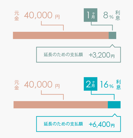 1ヶ月分の利息は40,000×8%=3,200円になります。1ヶ月期限を延長する場合は、3,200円をお支払いします。