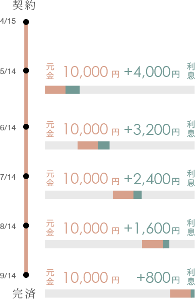 お支払い時までのお利息と、元金の一部充当をすることで、元金を少しずつ減らしていく事ができます。お借りしている元金が少なくなっていくので、月々のお利息も減っていきます。