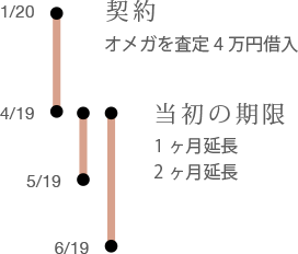 2ヶ月期限を延長する場合は、3,200×2ヶ月=6,400円をお支払いします。期限は当初の4月19日から2ヶ月の延長になったので、6月19日が期限になります。
